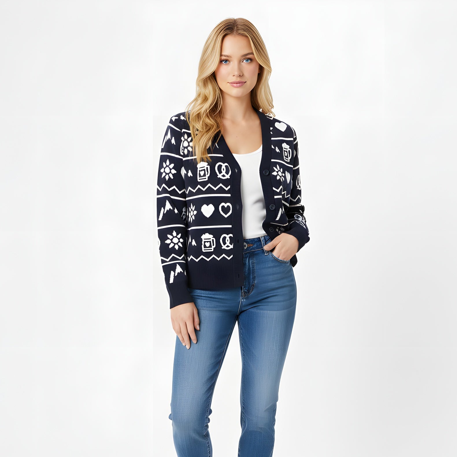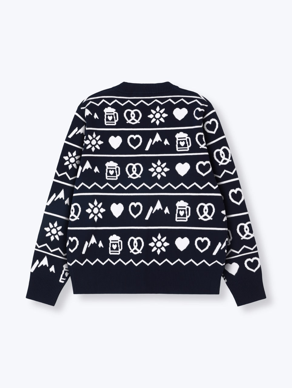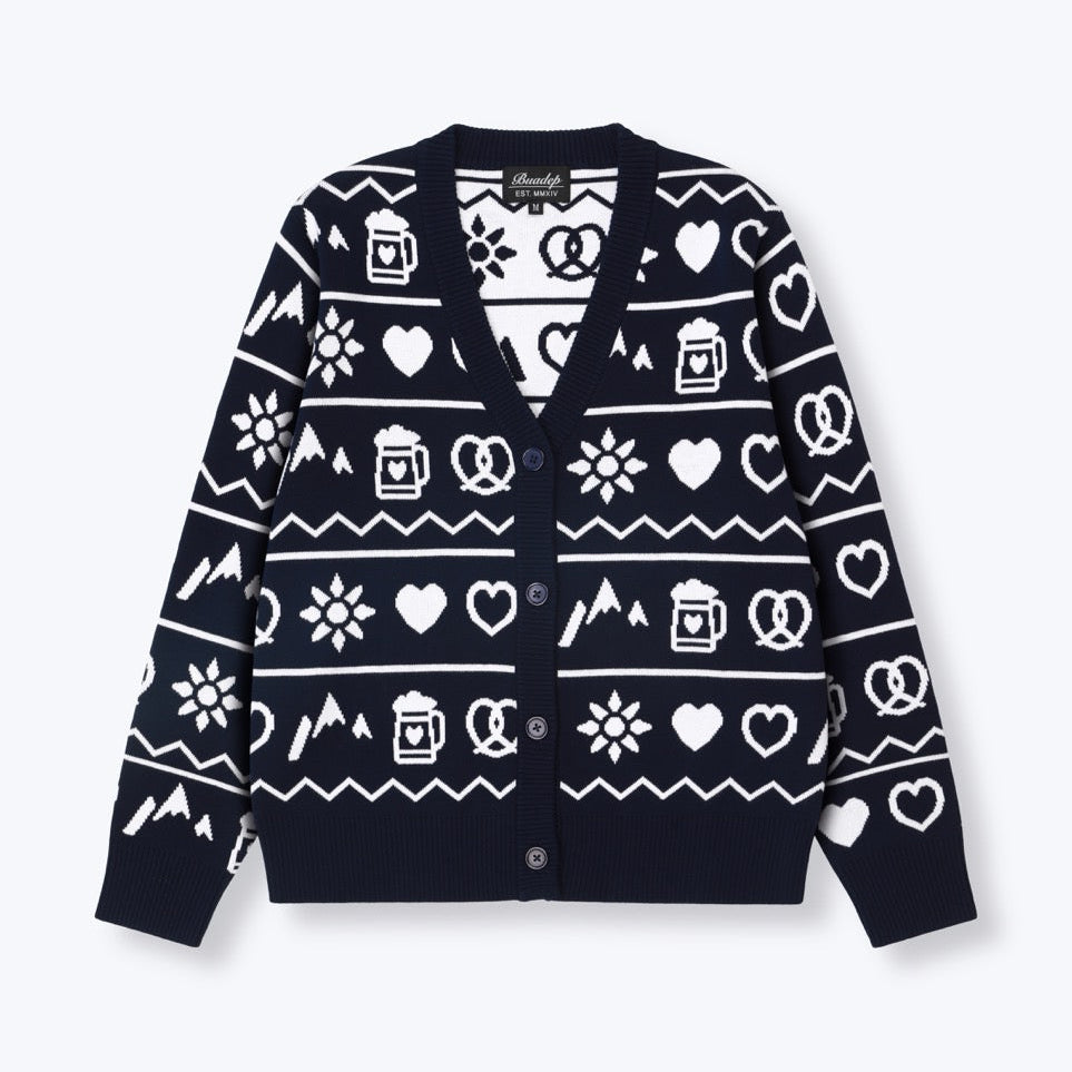 Diese Strickjacke ist ein liebevolles Statement für alle, die ihre Heimat im Herzen tragen – und dabei nicht auf Stil verzichten wollen. Der hochwertige Feinstrick sorgt für ein angenehmes Tragegefühl, während das dezente Muster mit Brezn, Maßkrug, Edelweiß und Herzen bayerische Tradition modern interpretiert.